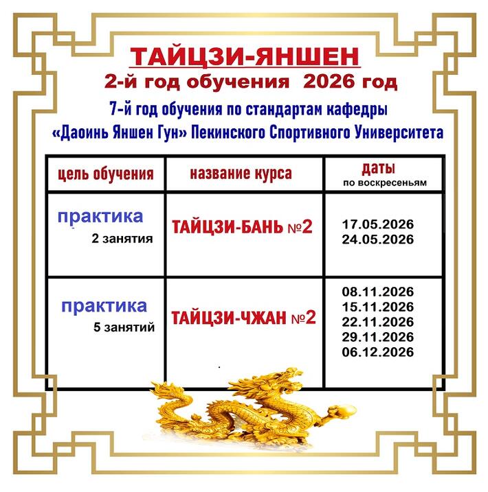 Выдача диплома о 2-х летнем прохождении курсов 2025-2026 годов оздоровительного ТАЙЦЗИ у профессора Ху Сяофэя и заместителя заведующего кафедры "Даоинь Яншен Гун" доцента Чжуан Юнчан возможна только при посещении всех мастер-классов и регулярных занятий с доктором Бутримовым до, между и после семинаров.